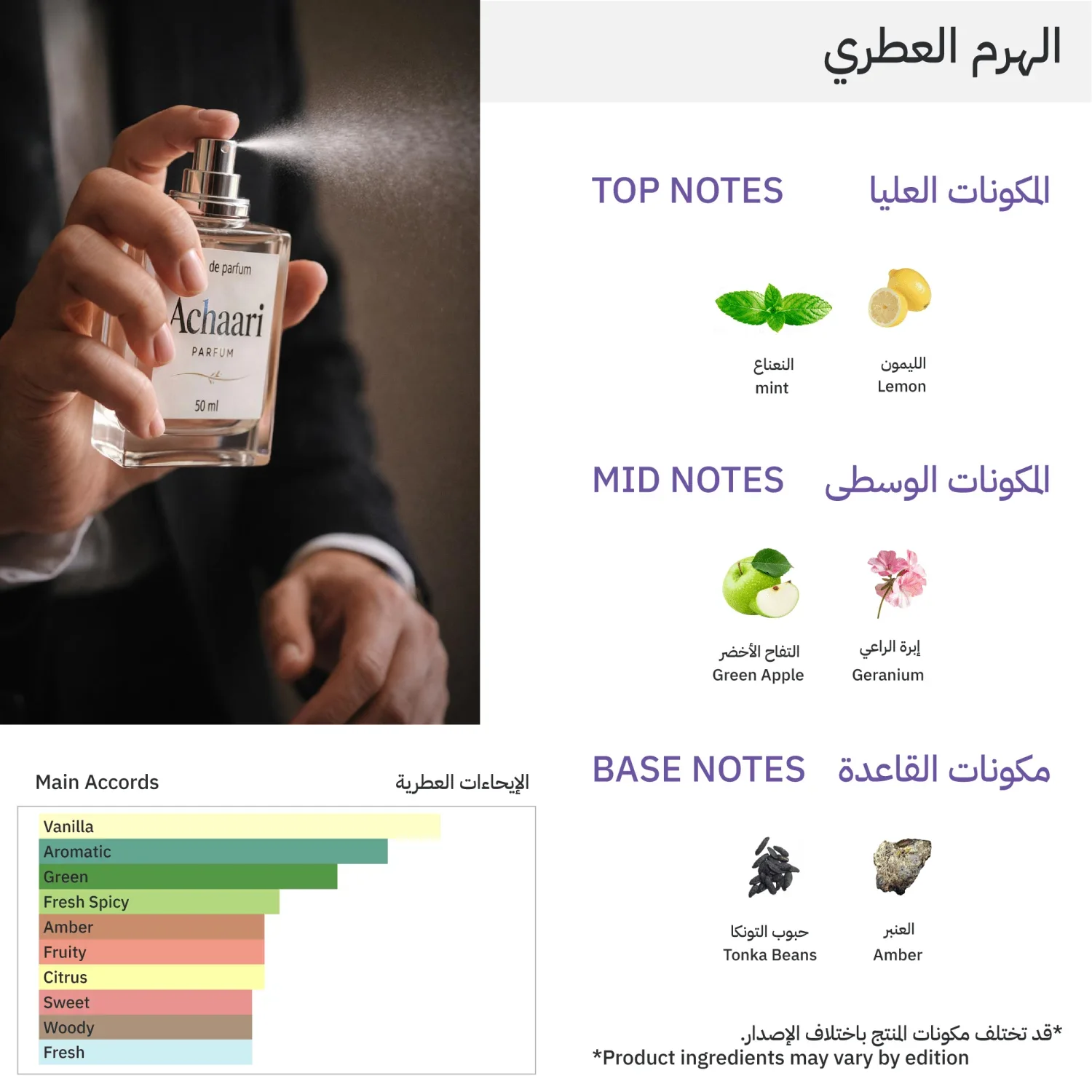 - إفتتاحية العطر: النعناع، التفاح الأخضر، الليمون الإيطالي.